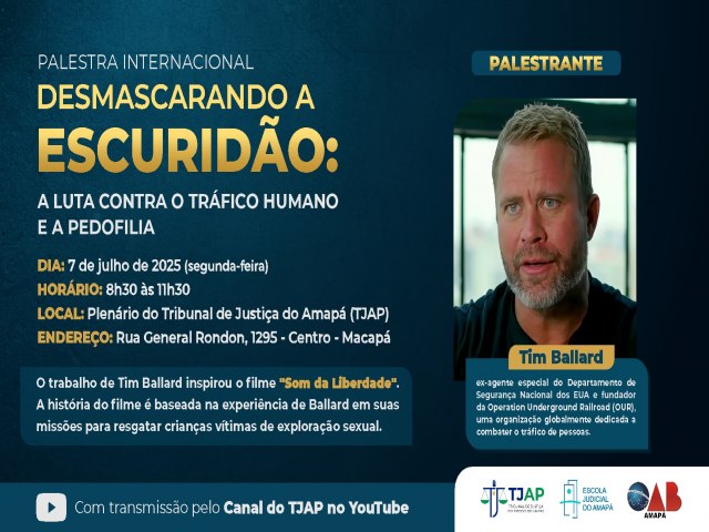 O Tribunal de Justiça do Amapá (TJAP), promoverá, em sua sede, na segunda‑feira (7), das 8h30 às 11h30, a palestra “Desmascarando a Escuridão: A Luta Contra o Tráfico Humano e a Pedofilia”, que será ministrada pelo renomado ex‑agente especial norte‑americano Tim Ballard. A iniciativa do Poder Judiciário, que será executada por meio da Escola Judicial do Amapá (EJAP), em parceria com a Ordem dos Advogados do Amapá- Secção AP, tem o propósito de reforçar o combate ao tráfico humano e à pedofilia por meio da cooperação internacional e ampliar a conscientização sobre a gravidade desses crimes e o papel do Sistema de Justiça na proteção.