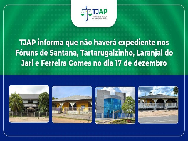 O Tribunal de Justiça do Amapá (TJAP) comunica que, em razão dos feriados municipais celebrados em 17 de dezembro (quarta-feira), não haverá expediente forense nos Fóruns das Comarcas de Santana, Tartarugalzinho, Laranjal do Jari e Ferreira Gomes. As quatro cidades comemoram sua emancipação político-administrativa, ocorrida em 1987, e, assim, completam 38 anos em 2025, conforme previsão legal vigente.